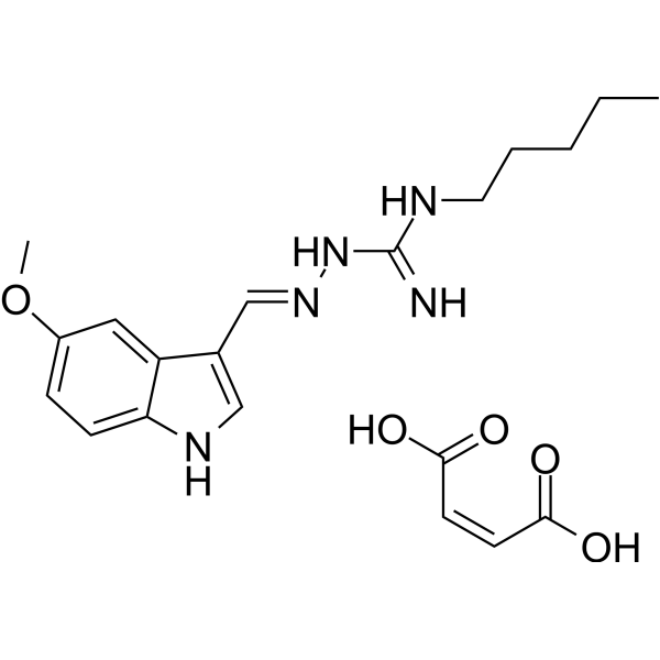 Tegaserod maleate (SDZ-HTF-919)/CAS No.189188-57-6 is an orally active serotonin receptor 4 (HTR4; 5-HT4R) agonist and a 5-HT2B receptor antagonist. Tegaserod maleate has pKis of 7.5, 8.4 and 7.0 for human recombinant 5-HT2A, 5-HT2B and 5-HT2C receptors, respectively. Tegaserod maleate causes tumor cell apoptosis, blunts PI3K/Akt/mTOR signaling and decreases S6 phosphorylation. Tegaserod maleate has anti-tumor activity and has the potential for irritable bowel syndrome (IBS) research.